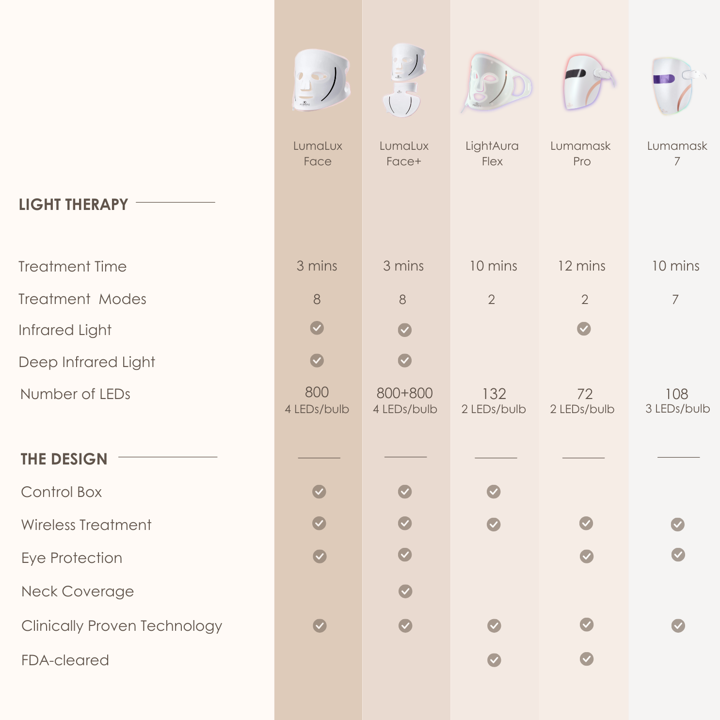 Clinically backed-wavelengths - red (630nm), blue (460nm) and infrared (850nm). Irradiance of 30mW/cm2 or above and a high number of LEDs