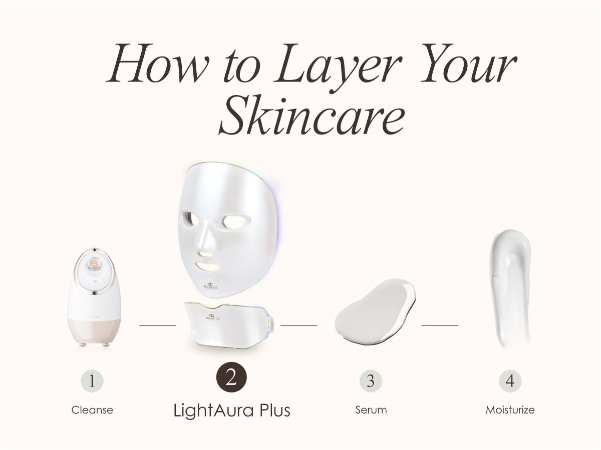 Use your LED light therapy device on a freshly cleansed face. Follow up with your favorite serum. We recommend a hyaluronic acid serum for an ultimate hydration boost. For stronger actives like retinol and vitamin C it's best not to apply directly after treatment to prevent irritation