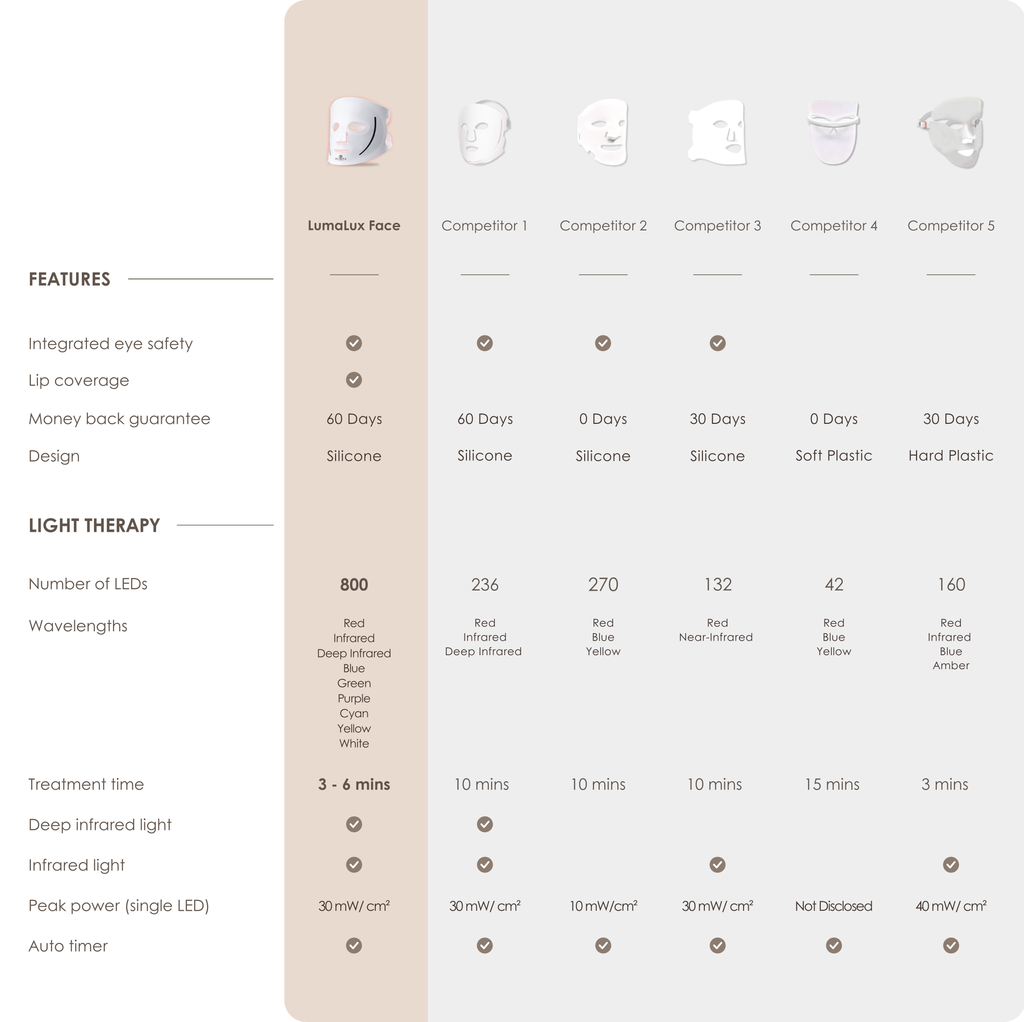 A: The LumaLux collection was born out of a desire to create the most powerful LED light therapy mask for at-home use with a simple and comfortable design. LumaLux uses professional-grade LED light therapy bulbs to deliver 30mW/cm² of power in just quick 3-6 minute sessions. We developed the concept by focusing on optimal light delivery, wavelength precision, and comprehensive coverage. We noticed that most brands average 66 bulbs on silicone masks - but this leaves much of the face untreated. LumaLux Face has 800 densely packed LEDs. You wouldn't apply your skincare to only part of your face, the concept for LED light delivery is the same