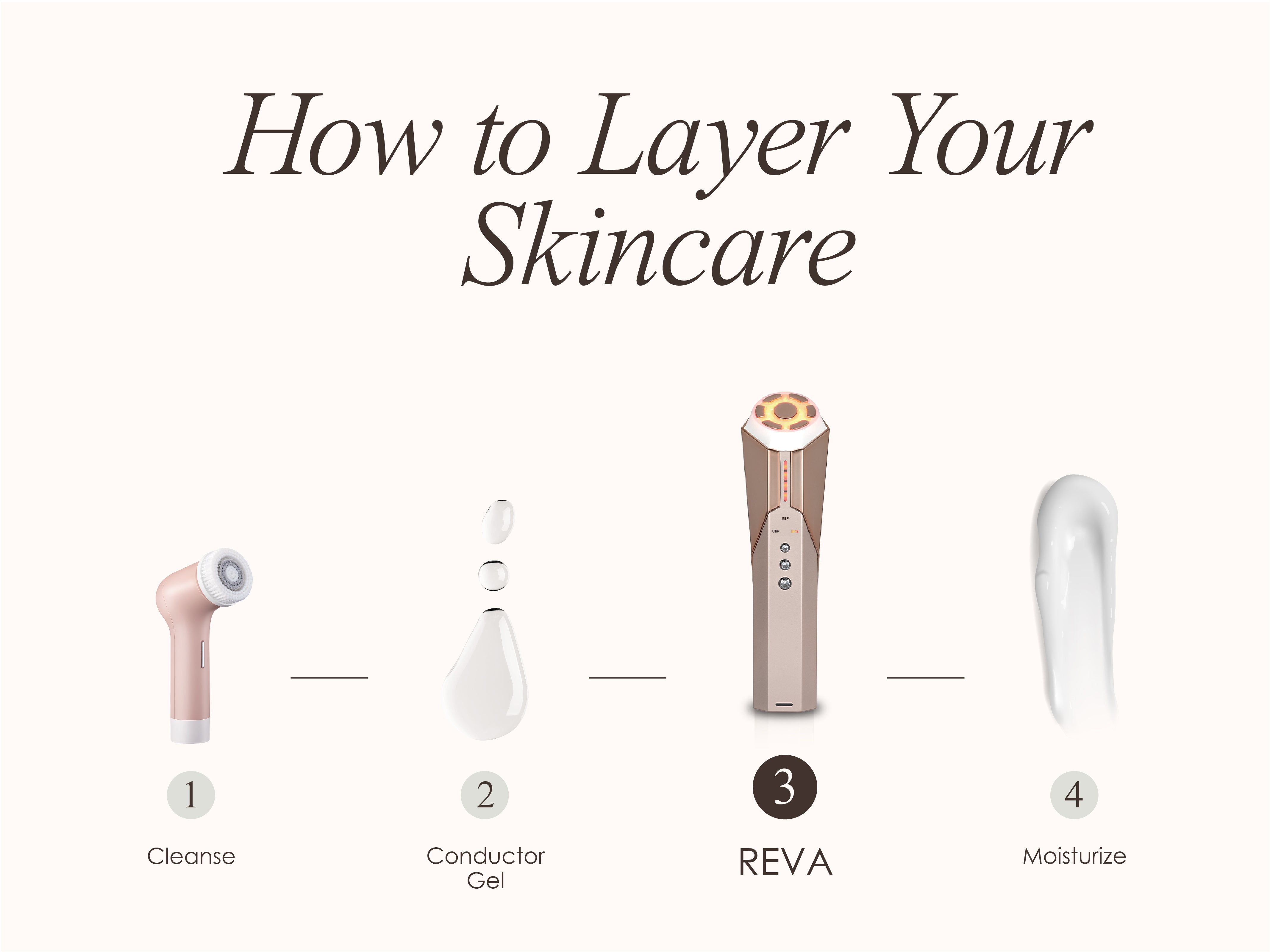 Use a conductor gel or water-based serum before treatment to ensure the device properly conducts energy. Follow-up treatment with your usual skincare routine. Focus on nourishing products such as hyaluronic acid, peptides, vitamin E or non-comedogenic oil based moisturizers oil-based. The Project E Beauty Lift & Plump Hydration Gel is designed for use BEFORE Reva, but you can also use your own skincare products