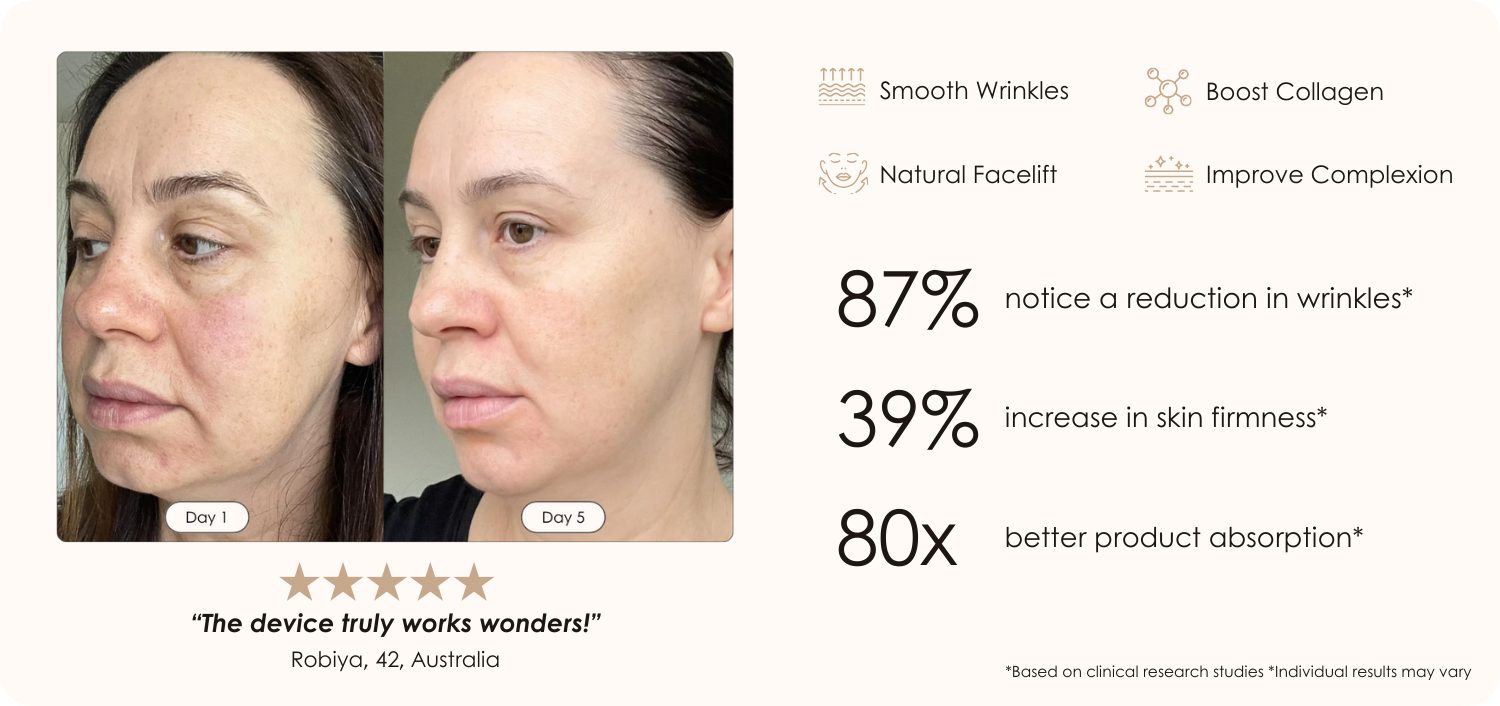 lift, tighten and support collagen synthesis. Micro-vibrations penetrate the dermal skin layer to stimulate skin and trigger the production of new collagen stores for firmer and tighter skin. Additionally, ultrasonic waves stimulate blood flow and improve skincare absorption. 86% experienced a reduction in wrinkle severity with ultrasound therapy*